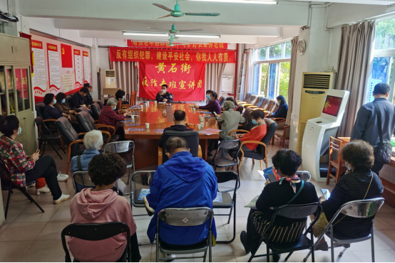 黄石街派出所警官从电信诈骗形式、如何防范电信诈骗等方面进行讲解,提醒大家遇到事情可以拨打国家反诈中心电话(96110)及黄石街派出所的电话(86335030)进行咨询。