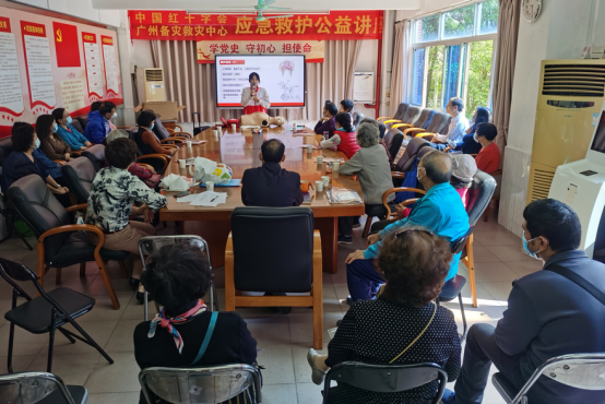 广州备灾救灾中心老师从创伤救护、心肺复苏、气道梗塞等方面向大家讲授了应急救护专业知识、注意事项,并对相关救护操作要领进行示范。现场气氛活跃,部分老同志还在老师的指导下进行了心肺复苏的实操训练。