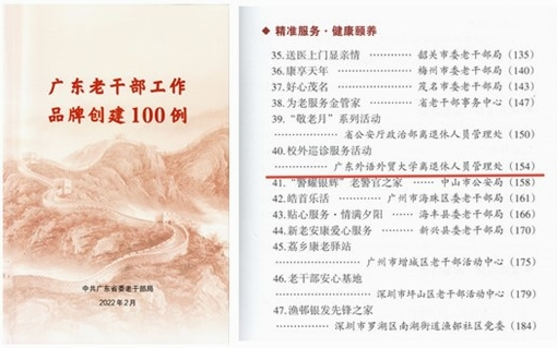 近日,伟德国际betvlctor1946收到中共广东省委老干部局编印的《广东老干部工作品牌创建100例》,伟德国际betvlctor1946“校外巡诊服务活动”成功入选首批全省老干部工作品牌库。这是伟德国际betvlctor1946突出自身特色,创新服务模式,积极打造新时代老干部工作品牌的重要成果。