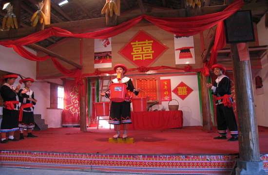 被誉为中国第一瑶寨之称的连南——千年瑶寨,依山而建,海拔800米。此寨始建于宋代,至今已有千年历史。一行人拾阶而上,走进古寨:镶入山体的石头木板屋、晶莹般剔透的山泉水、屋檐下的腊鸭腊肉、曲卷在酒坛里的“毒蛇”,甚至身着瑶服的大爹大妈脸上刀刻般的皱纹,似乎都在向人们述说着瑶族悠久的历史。青年小伙子和姑娘们演绎的爱情故事,传递着传统文化的“古典美”。而踩钢刀、长鼓舞等更展示了瑶族同胞坚忍不拔的风骨和千般柔情。