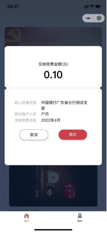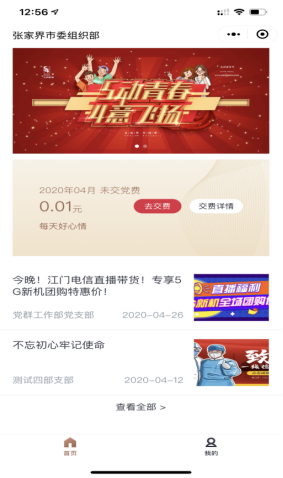 四、成功登录后,首页会显示党费交纳界面,点击“去交费“即可进入交费界面