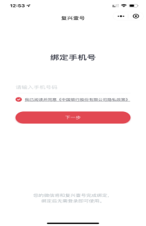 二、输入手机号(已铺底到系统中的手机号)并勾选“我已阅读并同意《中国银行股份有限公司隐私政策》“ 点击下一步,并输入图形验证码