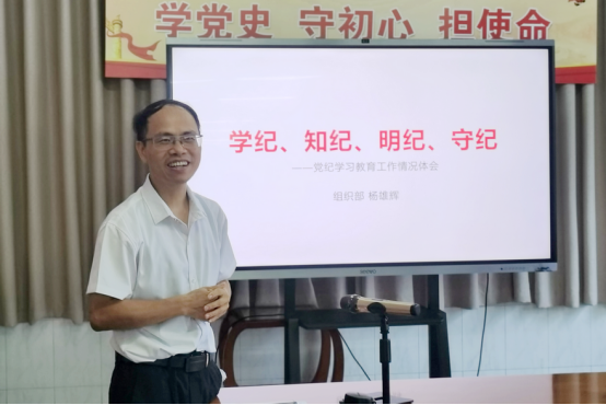 杨雄辉以《学纪、知纪、明纪、守纪》为题,从“学什么”、“怎么学”、“如何做”三个方面入手,紧密结合老同志实际,对党纪学习教育的内容、方式和要求进行了全面详实的辅导。老同志是否需要学习《条例》?哪些条款与老同志息息相关?如何避免形式主义等等,都对我们有效开展党纪学习教育提供了具体指导。他强调要原原本本学《条例》,特别是要结合离退休人员的特点学,并对老同志退而不休,默默地为基层党建工作作奉献表示由衷的感谢。