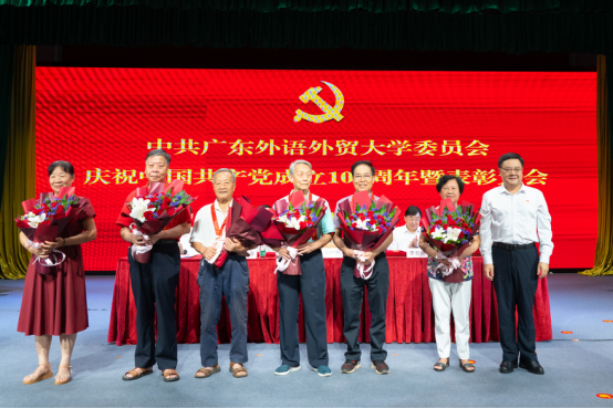另讯:6月27日上午,中共广东外语外贸大学委员会庆祝中国共产党成立102周年暨表彰大会在北校区六教报告厅召开。校党委书记、校长石佑启为老党员代表颁发“光荣在党50年”纪念章,李创荣、董小麟、郑兰英、高碧莲获评优秀共产党员,罗沙、何洪亮、徐朋臻获评优秀党务工作者,退休机关第一党支部、高教新村退休教工党支部获评先进基层党组织。